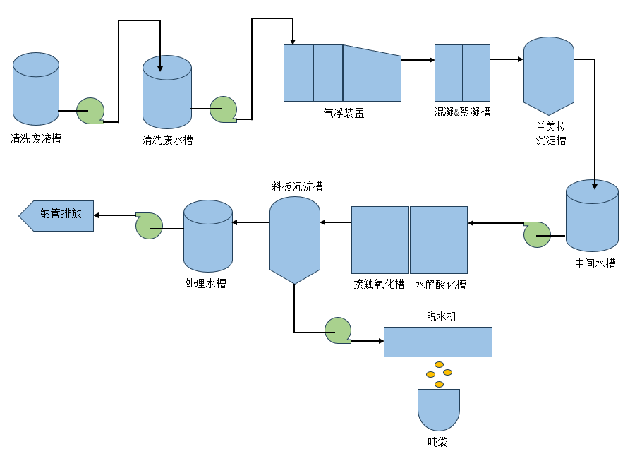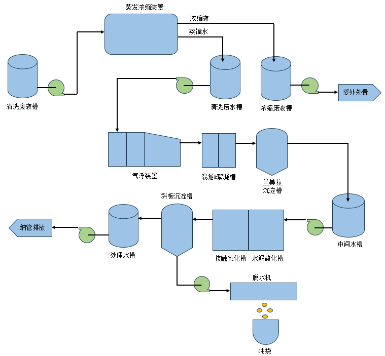 清洗废液由水泵定量输送至清洗废水槽,经曝气搅拌、均化,随生产废水经物化处理和生化处理达标后排入厂区排污管网。