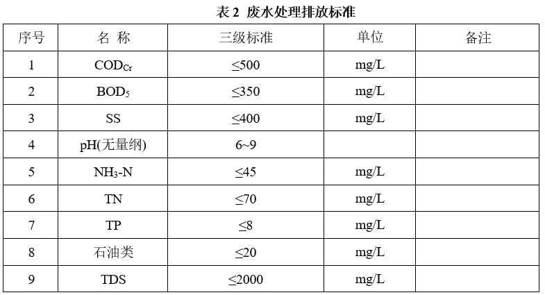 经处理的排放水要达到《污水综合排放标准》(GB8978-1996)三级标准,就近排入厂区废水管网,具体见表2。