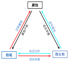 循环冷却水系统在日常运行的过程中,会面临水处理常见的腐蚀、结垢和微生物问题,并且这三者之间相互关联(如右图所示)。